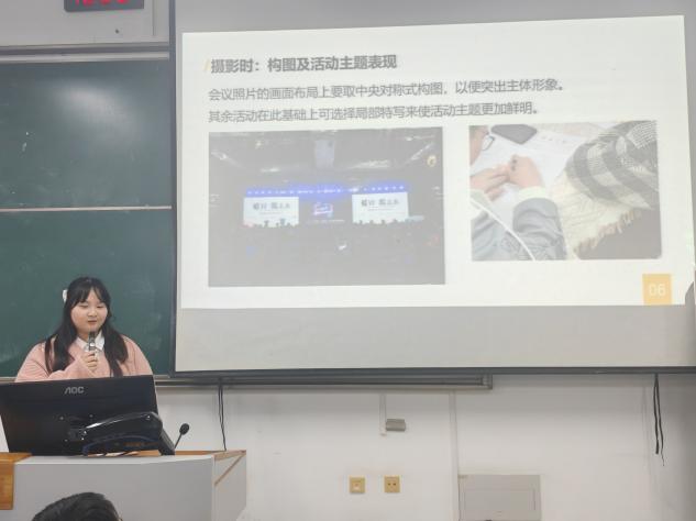 文宣部部长俞游游以《如何拍出‘国奖级’活动照片》为题,现场演示“黄金分割、对角线、框景”三大构图法,对比解析校运会“爆款”推文配图前后对比,手把手教学“光影参数预设—连选—快修”3分钟出图流程,让“小白”也能一键生成“大片”。