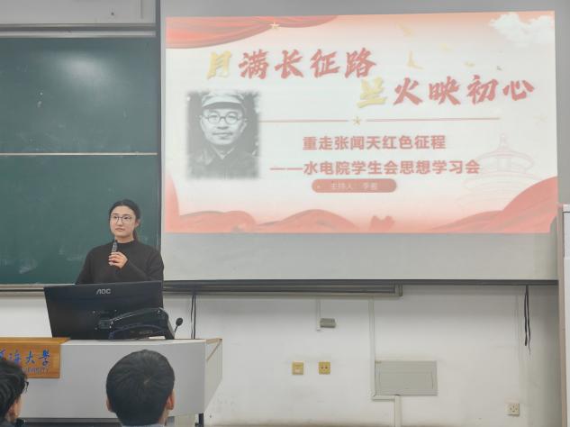 在重温红色记忆中砥砺初心使命,水电院学生会副主席李盈以《从张闻天精神看新时代青年的自我革命》为题作领学报告。她结合刚刚闭幕的纪念张闻天同志诞辰124周年学术研讨会精神,从“真理标准、人民立场、自我批评”三个维度,带领大家重温张闻天“真理在谁手里,就跟谁走”的崇高风范,并联系党的二十大报告提出的“六个必须坚持”,勉励全体学生会成员在学风督导、志愿服务、科研竞赛中自觉做“两个确立”的坚定拥护者、“两个维护”的示范引领者,让红色基因在水电青年中代代相传。