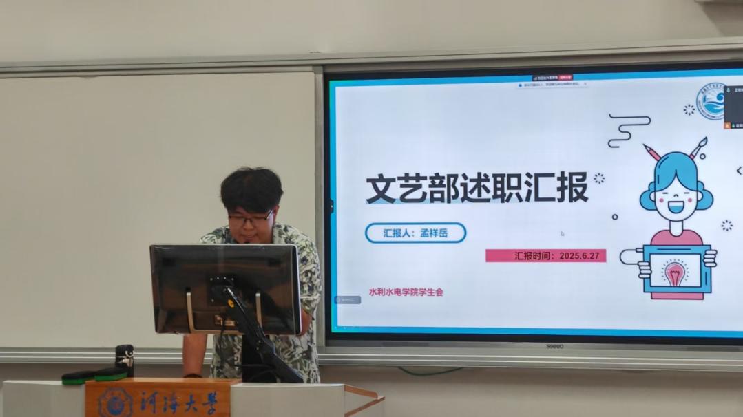文艺部孟祥岳同学详细介绍了本学年的工作成果,其中重点介绍了爱国歌曲合唱比赛等品牌活动。文艺部始终秉持丰富校园文化生活的宗旨,不仅为同学们提供了展示才艺、释放活力的舞台,更有效激发了广大同学的参与热情,显著提升了学院的艺术氛围与文化活力。