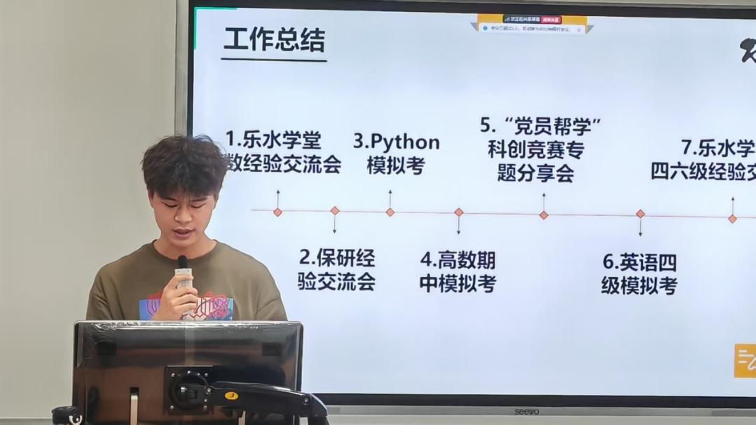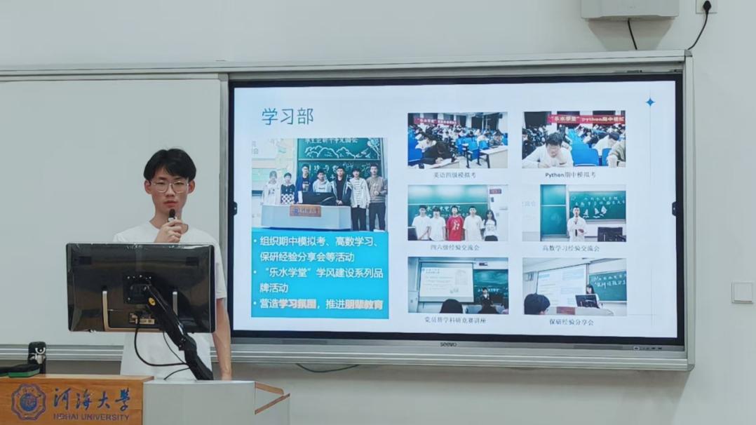学习部吴文锋同学以时间轴的形式展示了学习部举办的模拟考、经验分享交流会等各类活动,内容涵盖了重点课程、四六级考试、保研、科研竞赛等学业热点问题。学习部以服务学业为核心,以同学的实际需求为出发点,积极为同学们的学习之路扫清障碍。