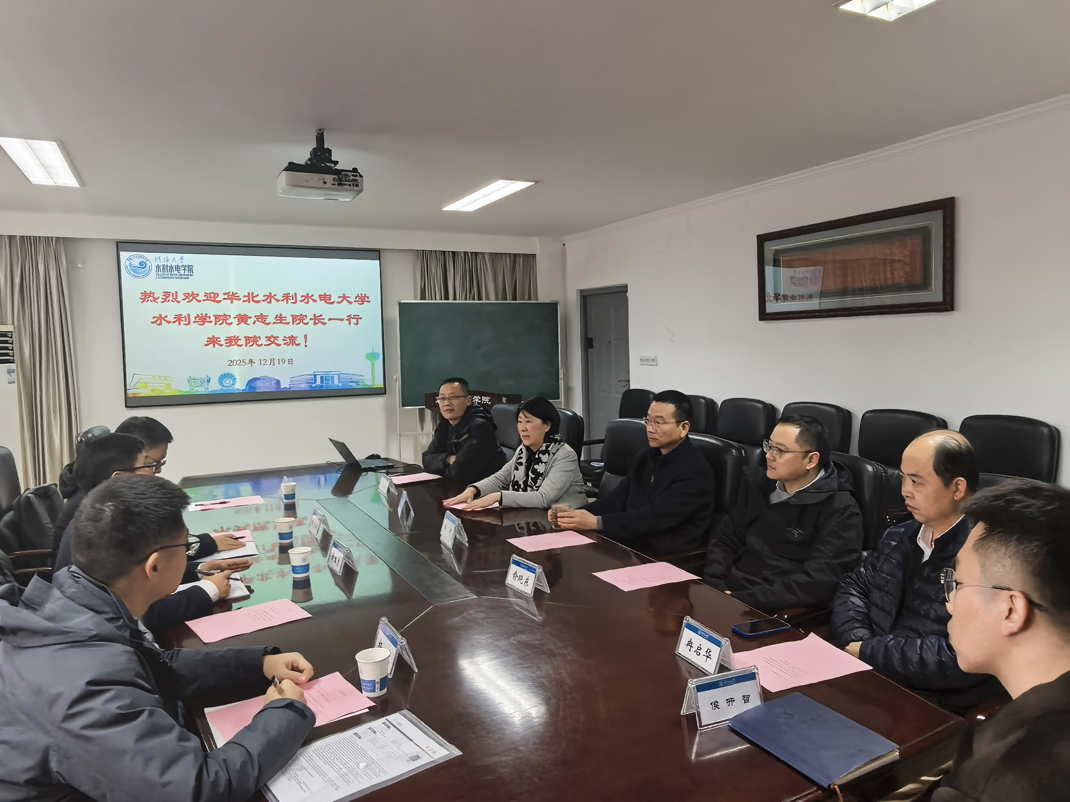 为深化校际合作,共谋水利学科发展与“双一流”建设,12月19日,华北水利水电大学水利学院院长黄生志、党委副书记张长辉、学科与研究生管理办公室副主任杨光、博士后科研流动站建设办公室主任冯凯一行莅临成人抖音 进行交流访问。成人抖音 党委书记娄健、院长王媛、副院长冉启华、赵兰浩、俞晓东,辅导员侯开智热情接待了来访嘉宾,双方举行了亲切友好的座谈。