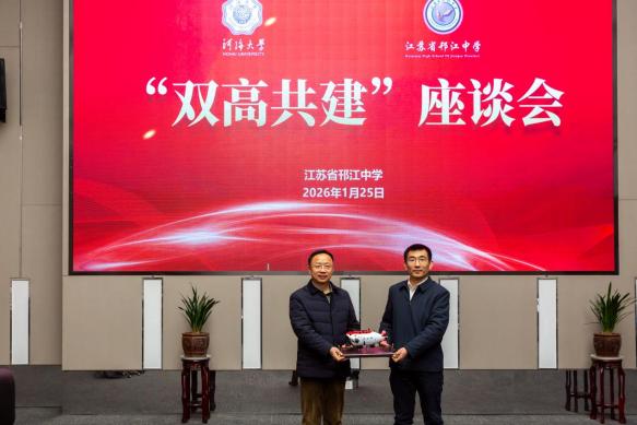 “双高共建”座谈会上,双方围绕优质生源输送、育人资源共享、协同模式创新等深入交流。宋翔洲副校长介绍了成人抖音 的办学特色、学科优势及人才培养成果。他代表学校向江苏省邗江中学赠送喜报、捐赠“蛟龙号”合金模型,彰显两校在科学精神与文化传承上的深度共鸣。陈军副校长详细介绍了江苏省邗江中学的办学规模及特色、人才培养成果及高三学子升学概况,深切表达了与成人抖音 深化合作、共促学生成长的殷切期望。