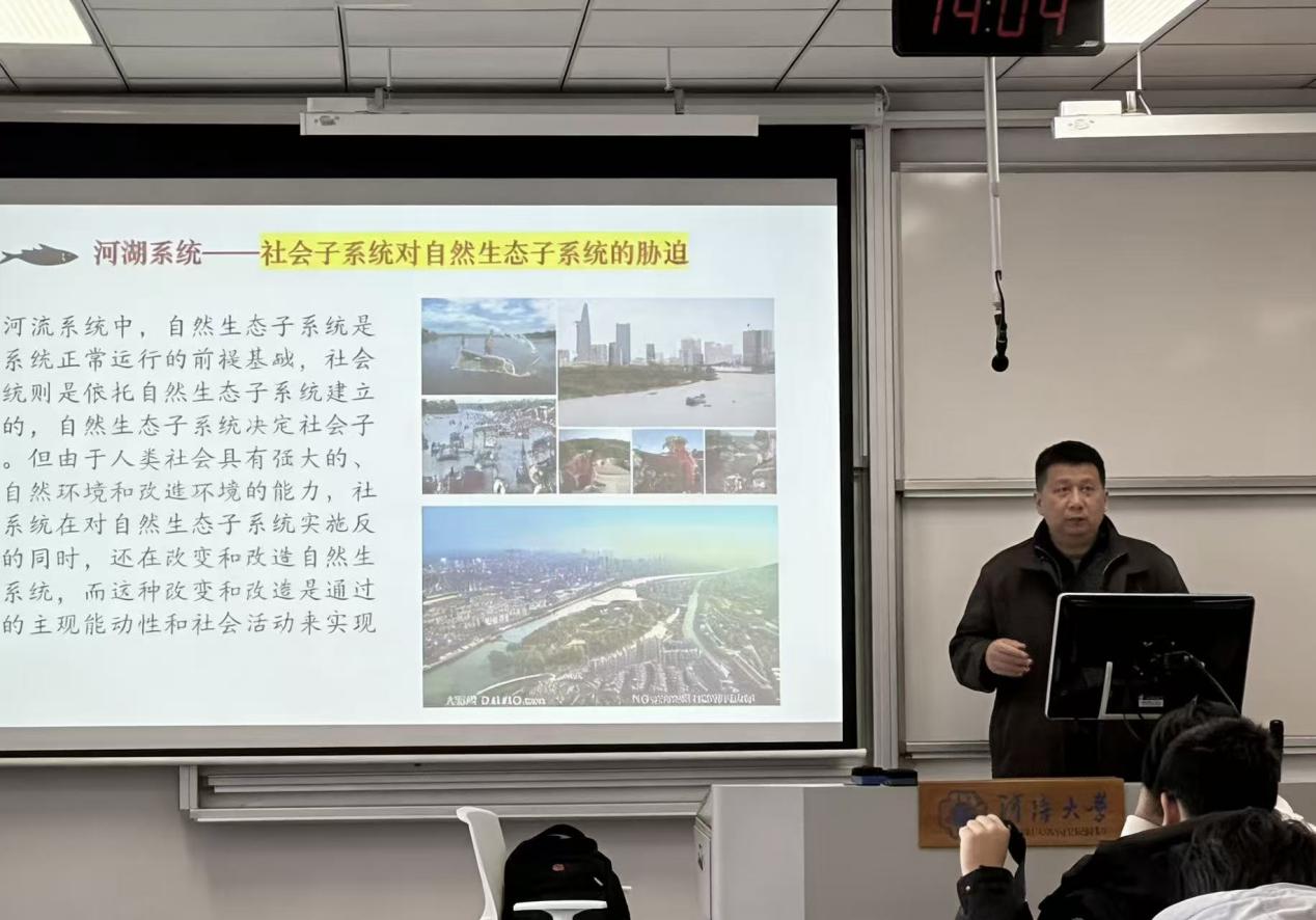 讲座伊始,吴龙华教授以“河湖系统——社会子系统对自然生态子系统的胁迫”为核心主题,开篇明义地阐释了河湖生态系统的核心构成与运行逻辑。他指出,在河流生态系统的整体架构中,自然生态子系统是一切运行活动的前提与基础,其水文循环、生物链结构、水土保持能力等要素,共同构筑了河湖系统的生态基底。在阐述两大子系统的依存关系时,吴龙华教授结合多年研究成果,深入剖析了人类社会的主观能动性所带来的双重影响。他强调,人类具备强大的适应与改造自然环境的能力,这种能力在推动社会进步、提升生产效率的同时,也让社会子系统对自然生态子系统形成了显著的反作用。不同于自然演化的缓慢进程,人类通过工农业生产、城市建设、生活活动等社会行为,对自然生态子系统进行着主动且深刻的改变,这种改变既包含合理的开发利用,也潜藏着不容忽视的生态胁迫,而这正是当前河湖生态保护面临的核心问题。