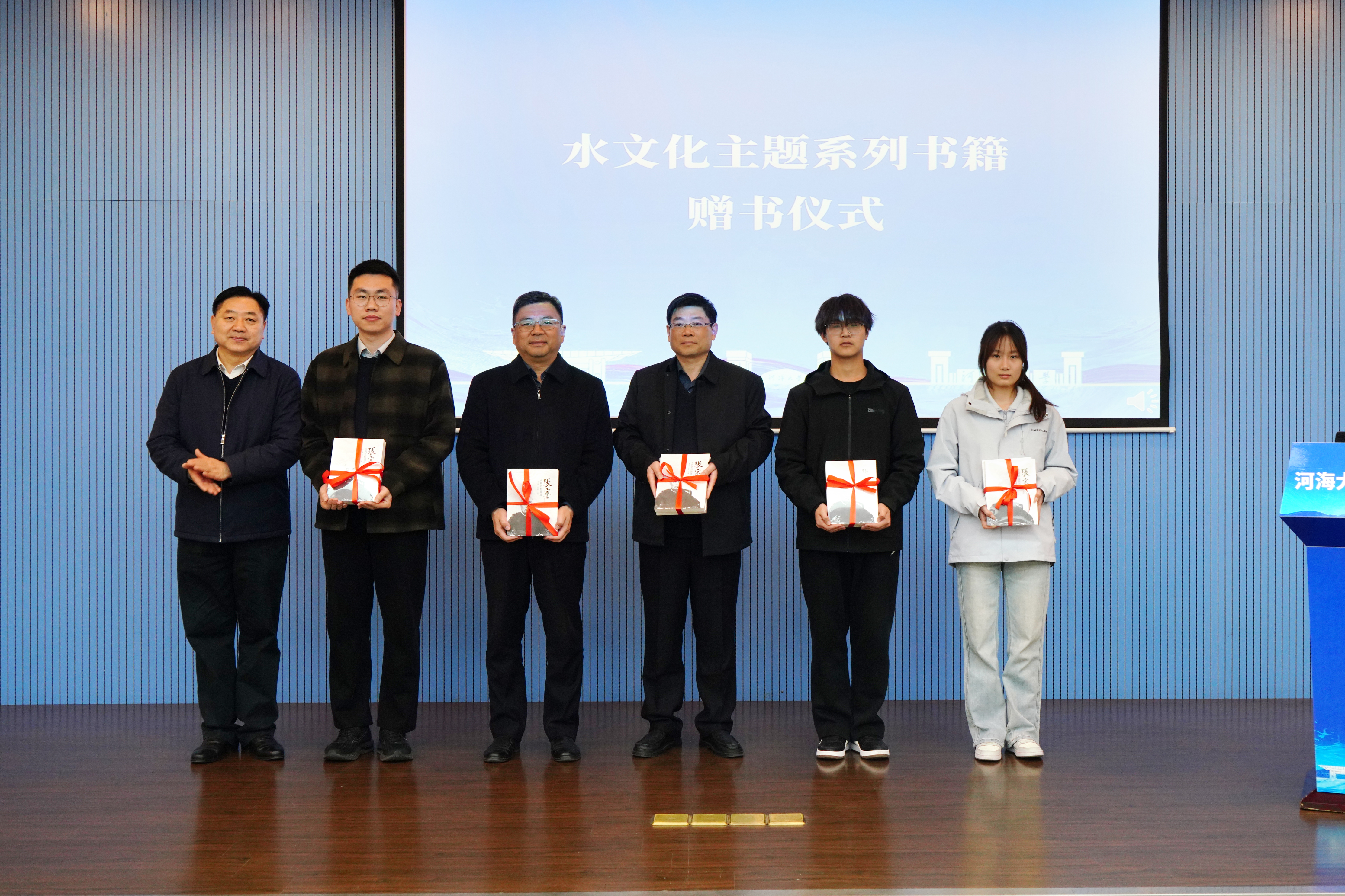 陆国宾向安徽省临淮岗洪水控制工程管理局、图书馆和学生骨干代表赠送《张謇水利思想循迹》书籍。